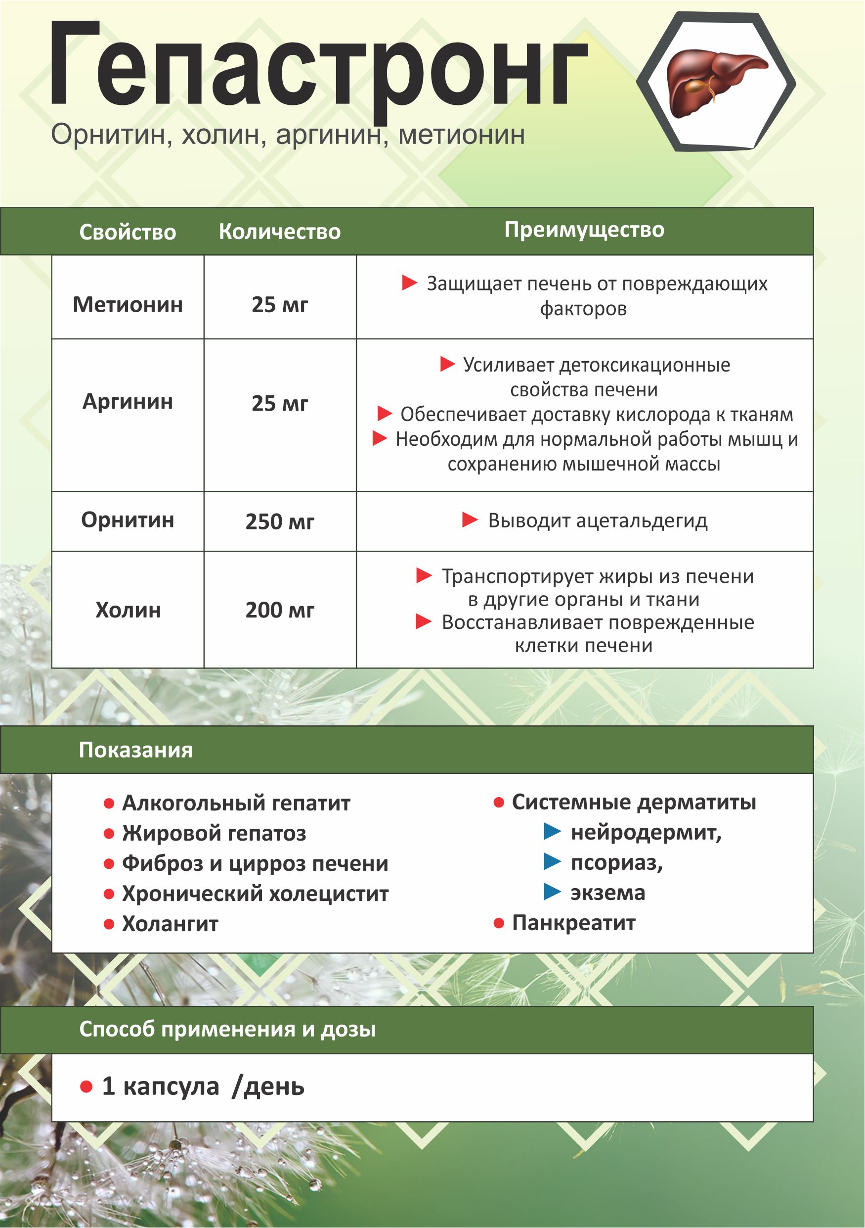 Հեպաստրոնգ Ամինո դեղապատիճը օգտագործվում է լյարդի ֆունկցիայի կարգավորման համար . Խոլինն օգնում է ապահովել լիպիդների և հոմոցիստեինի նորմալ նյութափոխանակությունը, ինչպես նաեւ կարգավորում է լյարդի նորմալ ֆունկցիան։