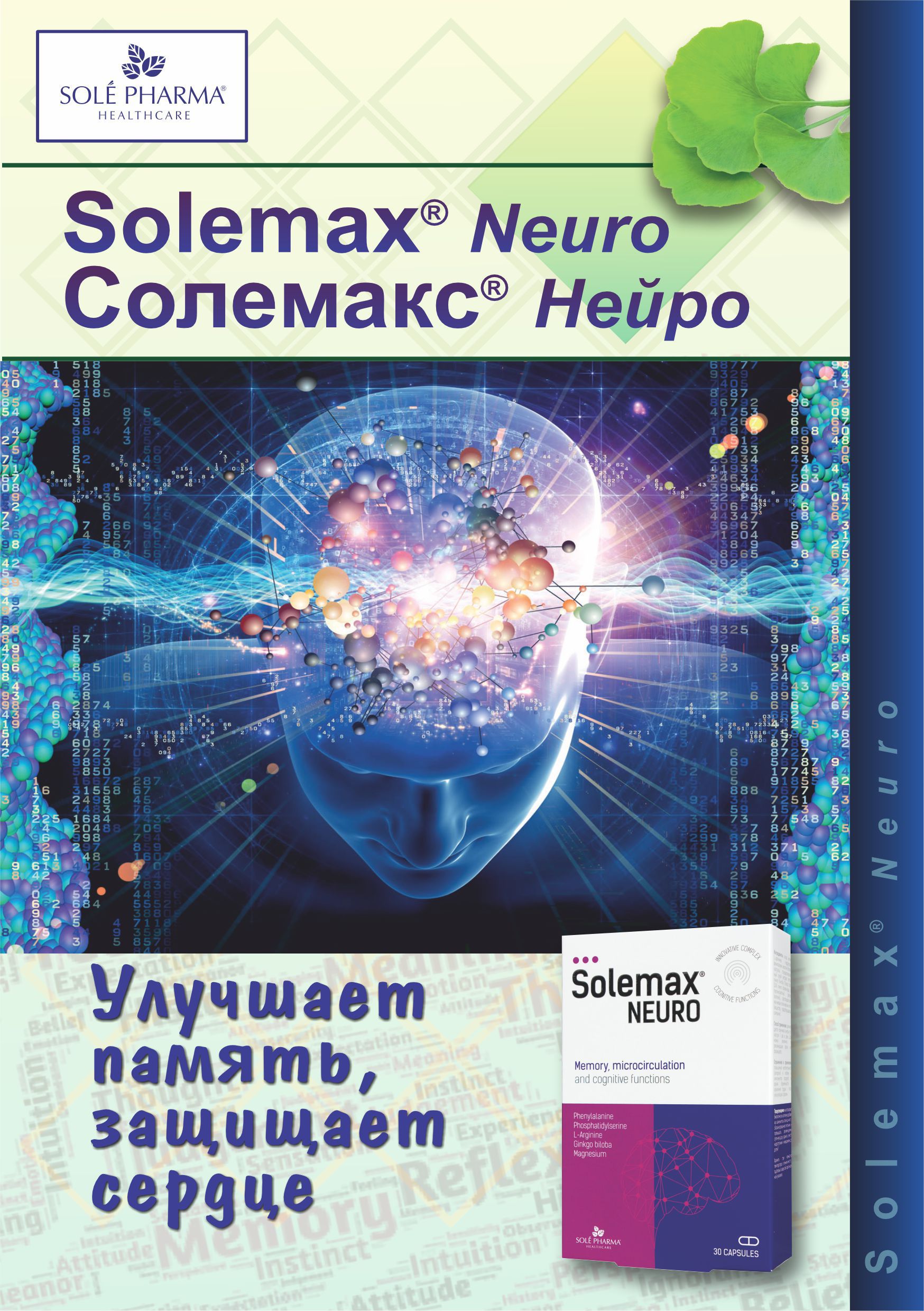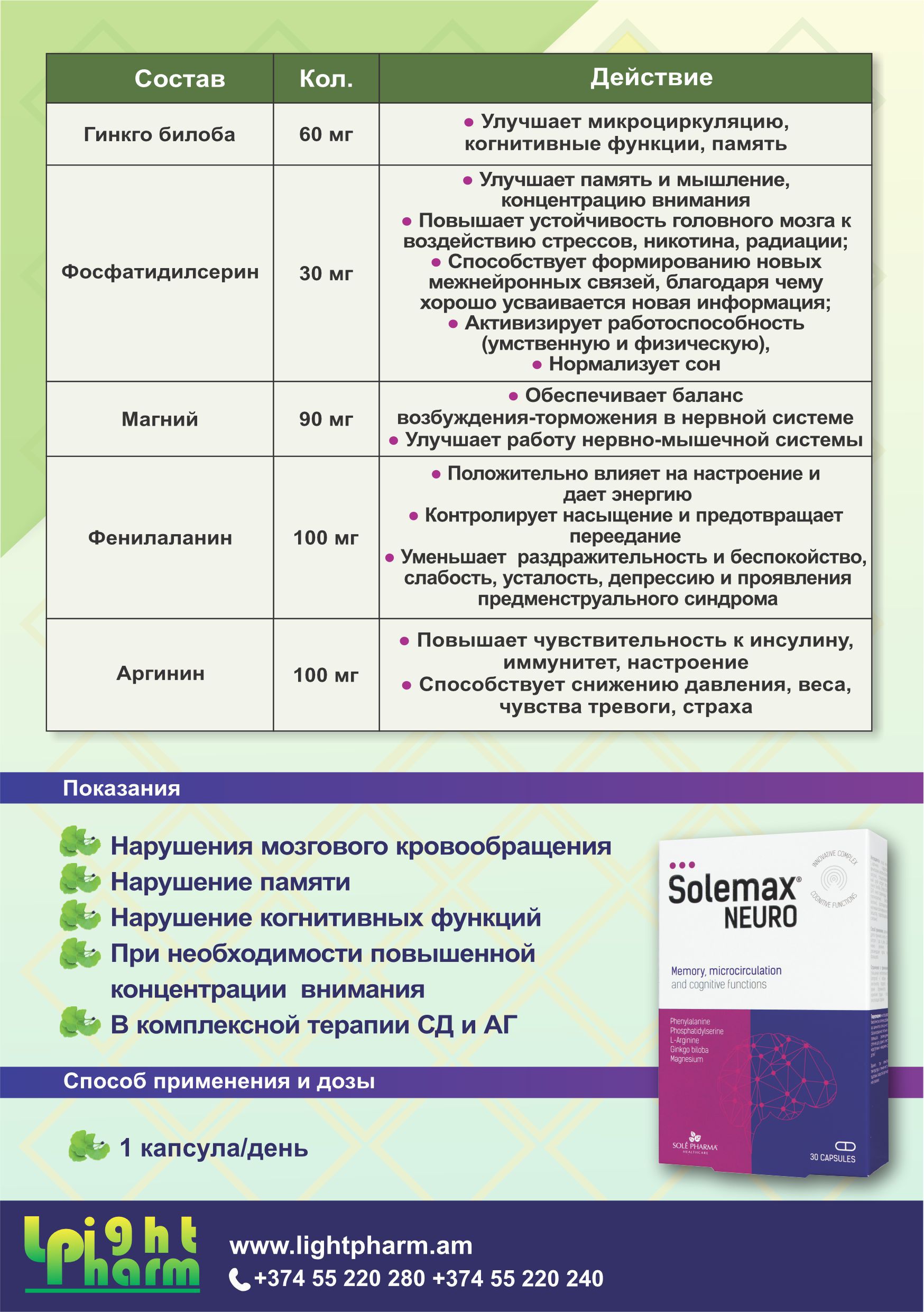 Սոլեմաքս Նեյրո-ն ամինաթթուների և բուսական հանուկների նորարարական համալիր է: Oգնում է պահպանել նորմալ ճանաչողական ֆունկցիան, բարելավել հիշողությունը և արյան միկրոշրջանառությունը: